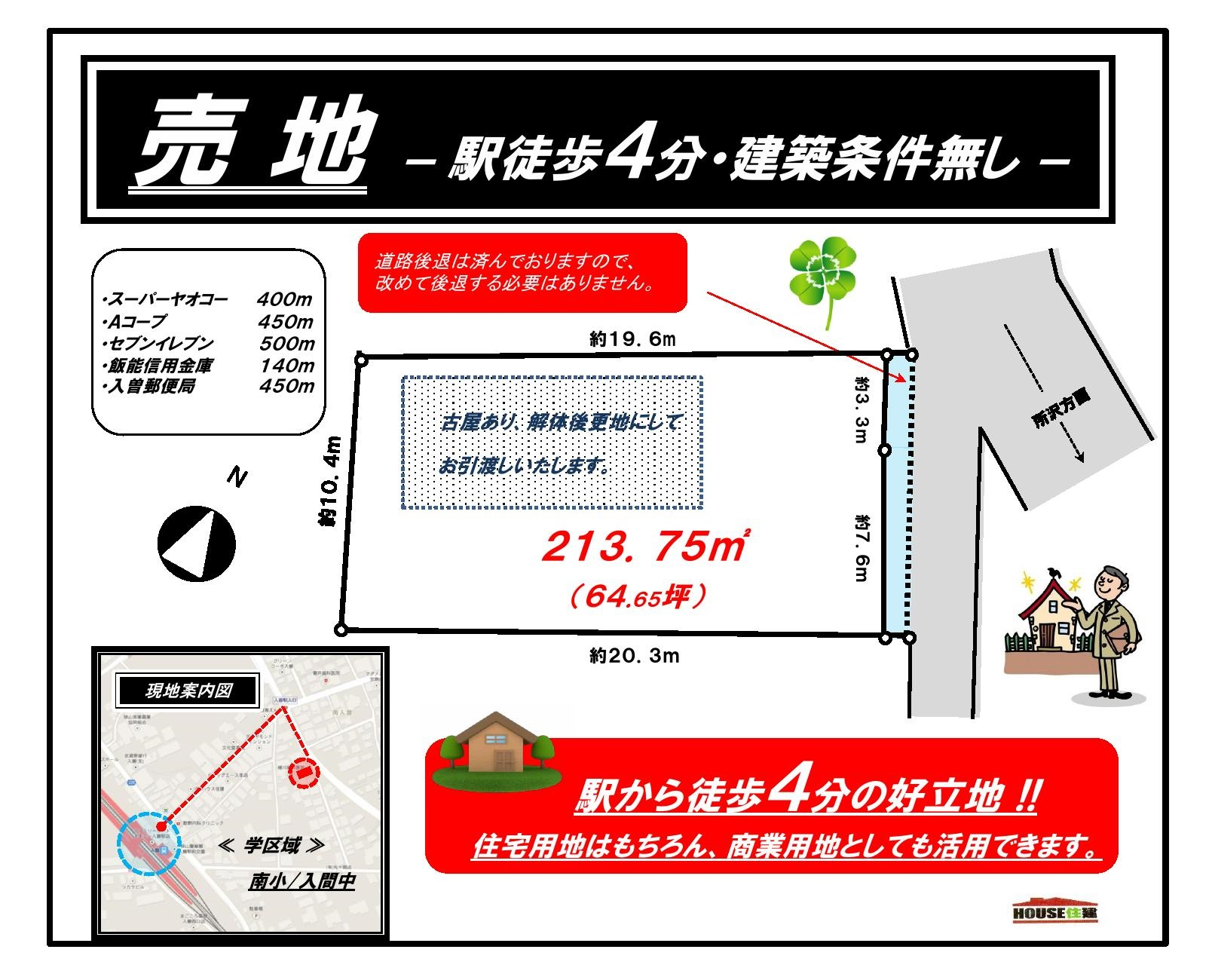 入曽駅徒歩4分の売地物件です。64.6坪の敷地ですので、お車を複数台所有の方でも十分な大きさです。